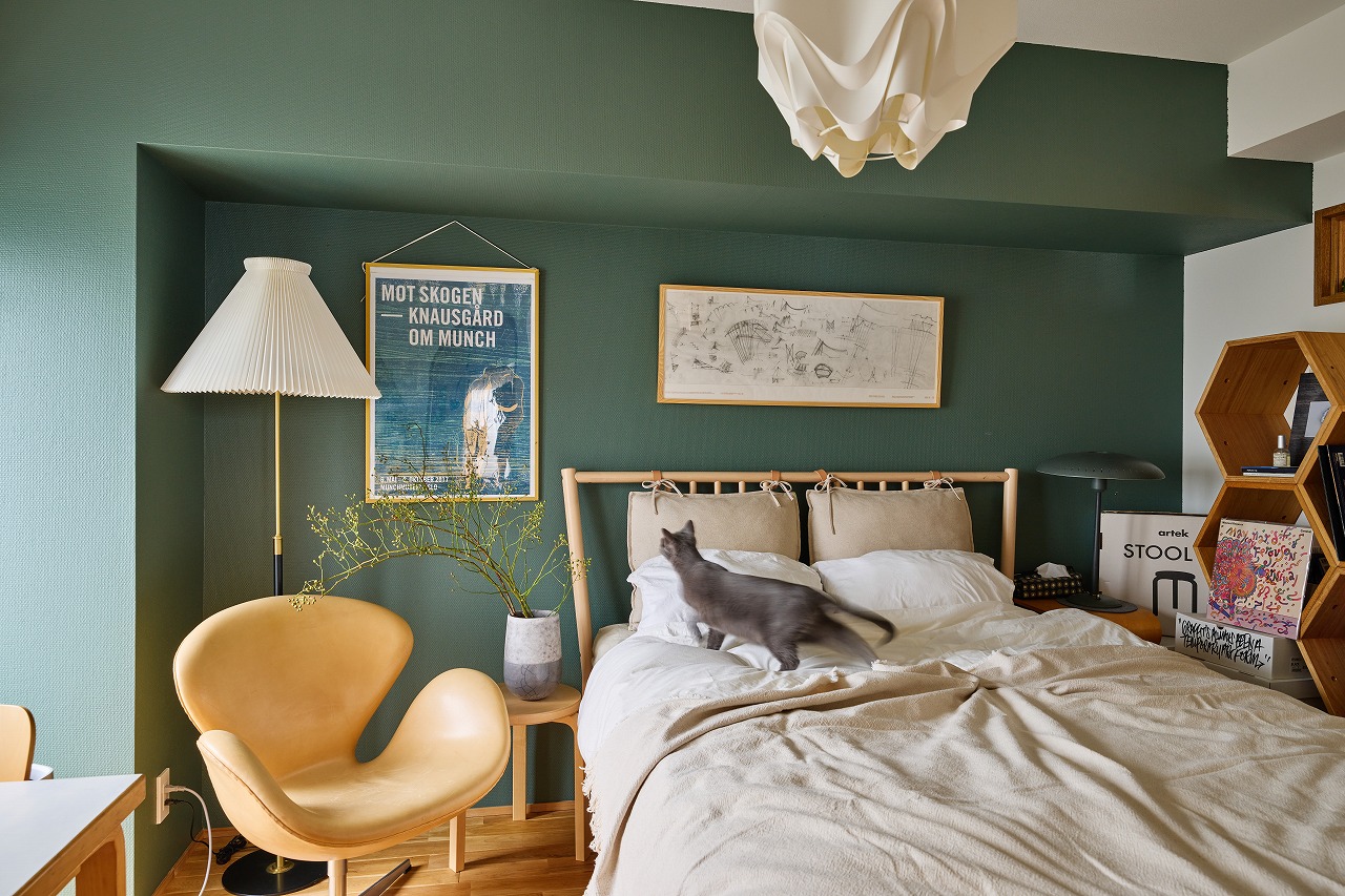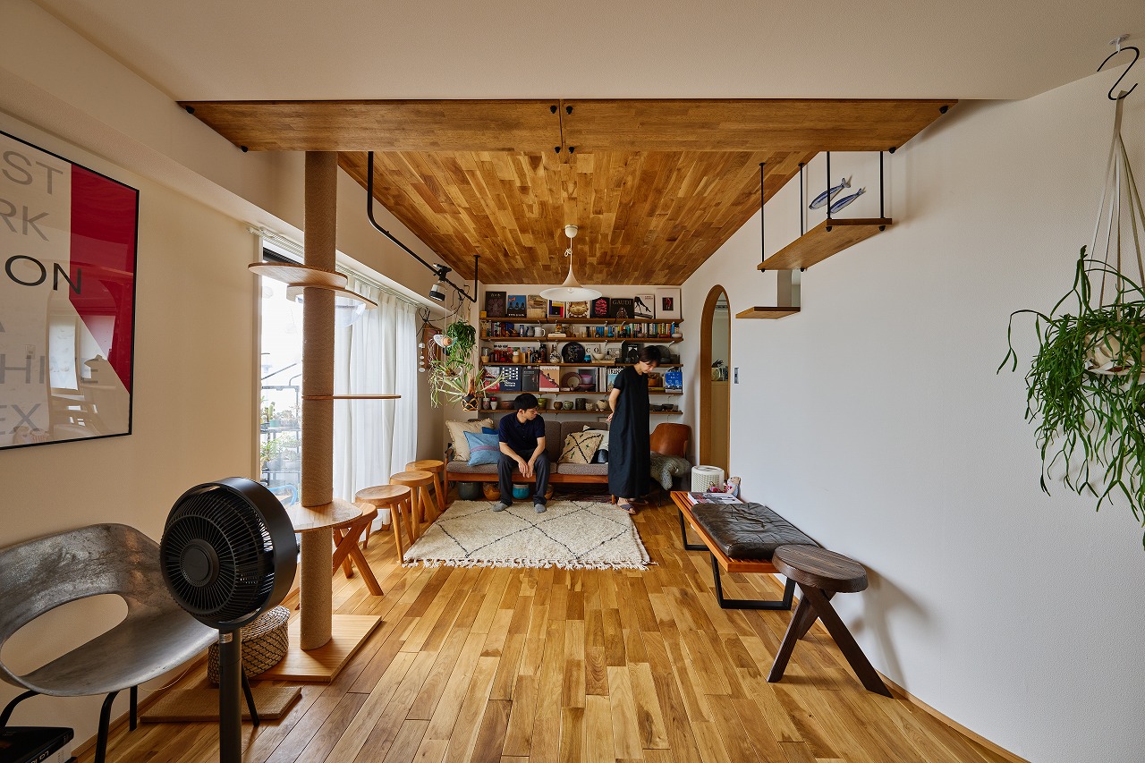 巨匠の手がけた名作に、革張りのチェア、雰囲気のあるスツールまでコレクションは30脚近く! リビングだけではなく、寝室やワークスペース、廊下まで、その時の気分次第で腰かけ、一息ついた視線の先には、自由に遊ぶ愛猫と、アート系の本、夫婦で集めたインテリアの品々。プランニング中に設計担当から提案があった大きなRの壁は、空間のアクセントにもなっていて、夫婦ともにお気に入り! 無垢の床材や白壁、板張りの天井、壁一面の飾り棚、愛猫用キャットウォークなど、インテリアへのこだわりも随所に取り入れました。「自分たちの好きなもの」を包み込むオーダーメイドの家は大満足の仕上がりとなりました。