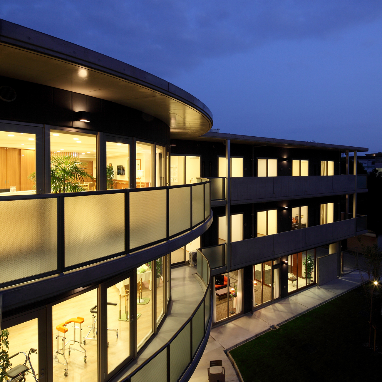 都市の成熟した住宅街に建つ老人ホームです。都市公園に接する敷地に、公園の広がりと借景を取り込むように建物を計画しました。プランは公園に向けて日中を過ごす共用スペースを中心に据えL型に住居部門及びサービス部門を配置し、暗くなりがちな中廊下の中央に光庭を配置、採光と通期に配慮しました。