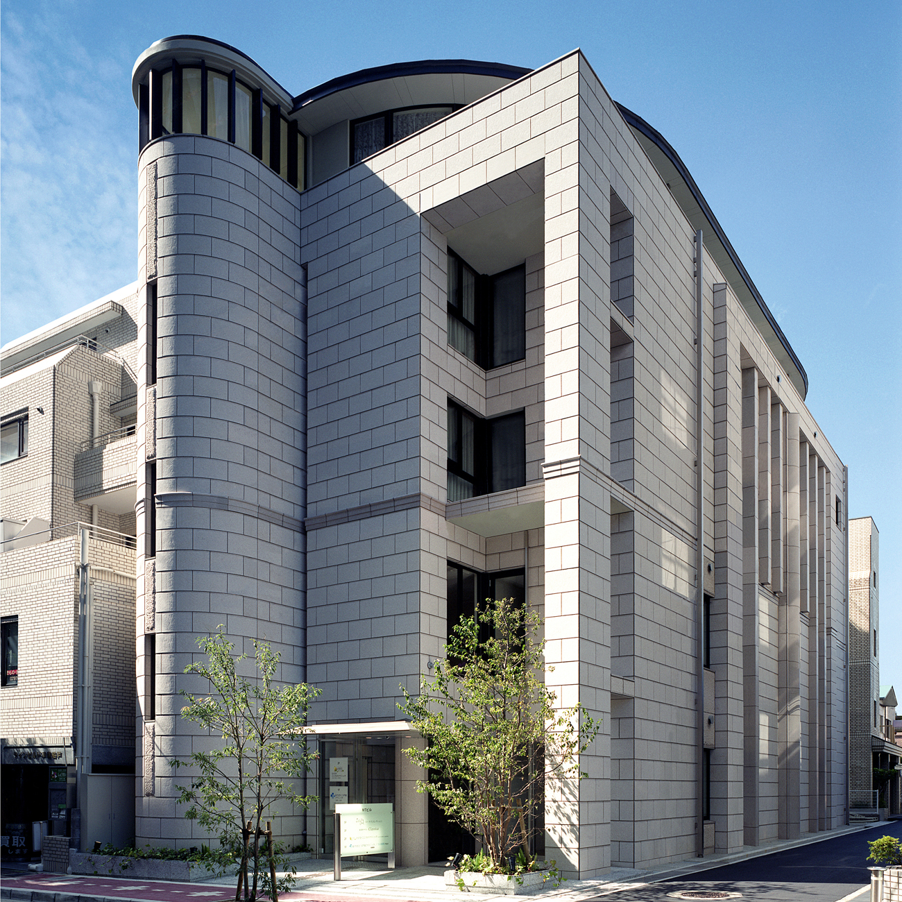 1、2階には各々、診療所が入居し、最上階の5階には半円の曲線と高い勾配天井でゆったりとしたジュエリーサロンと山の眺めを楽しみながら多目的にくつろぐための部屋を設けています。